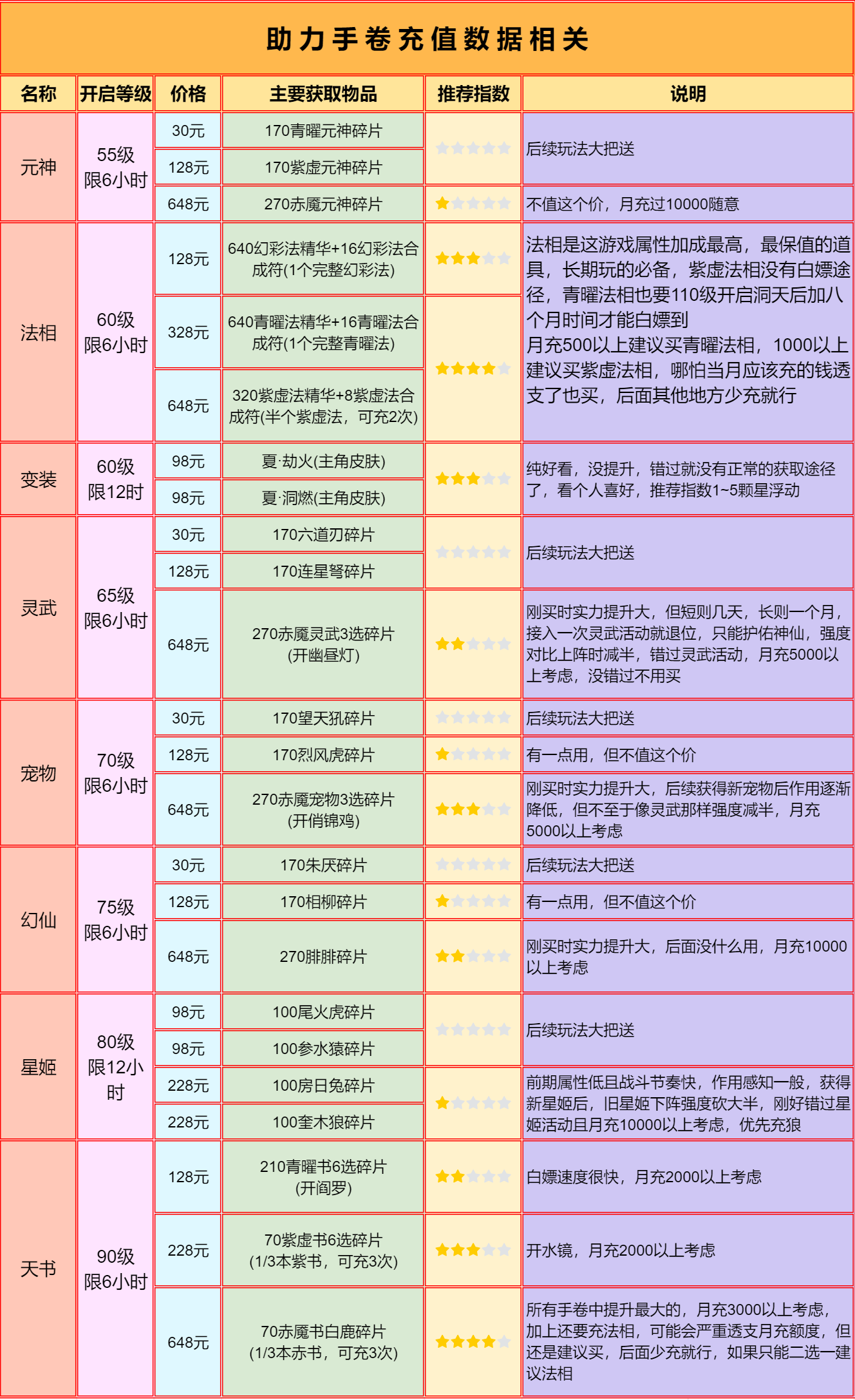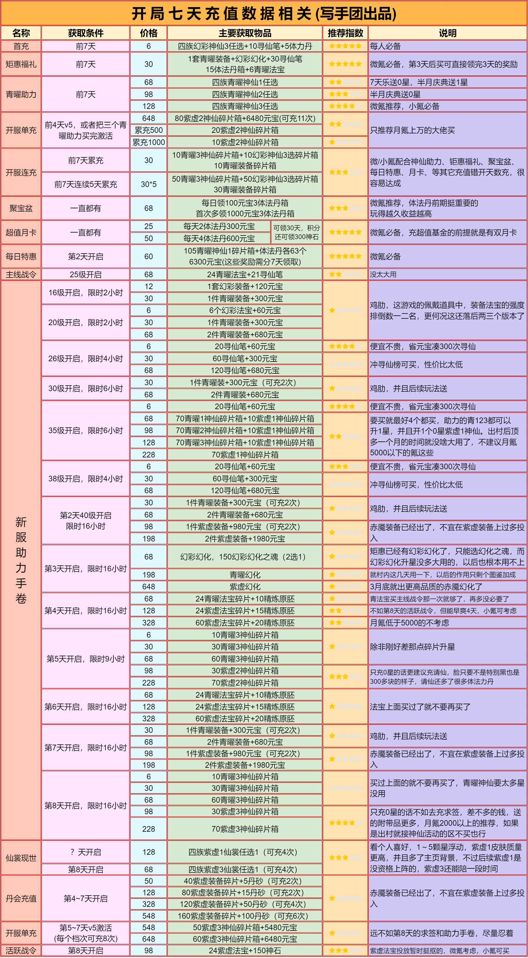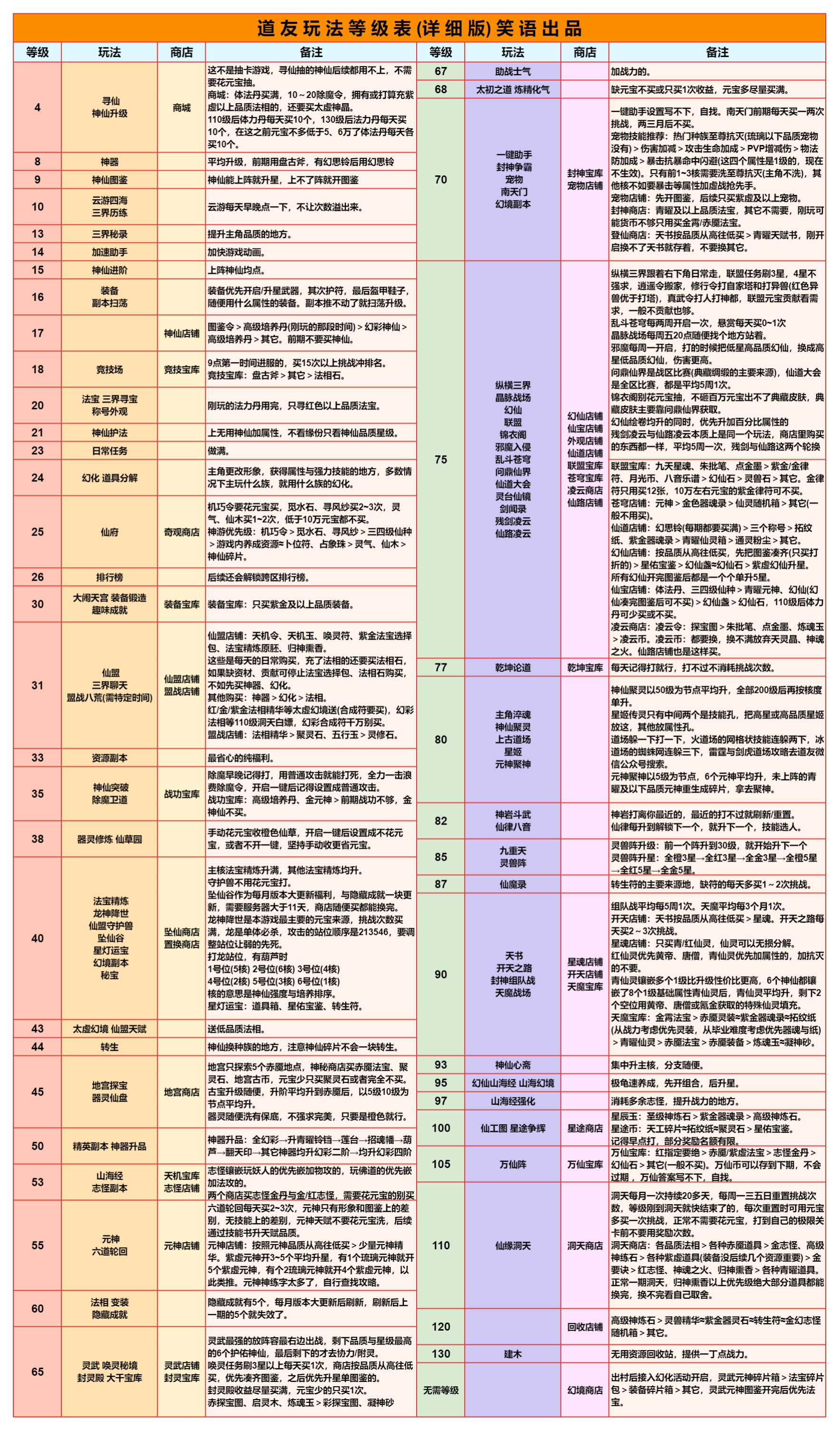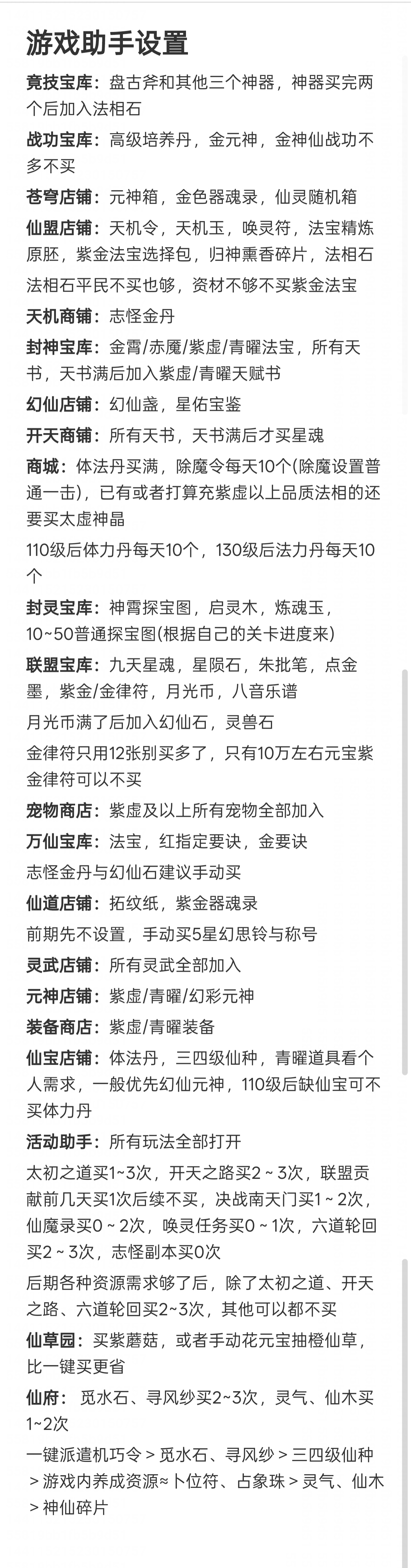 道友请留步是一款神话休闲卡牌游戏,由超人气的收视女王陈乔恩代言。以神话剧情铺开游戏画卷,一句道友请留步,申公豹坑遍天下道友。在这个游戏世界里,你会不会被这一句魔一般的咒语坑到呢赶快来试试吧! 道友请留步阵容推荐混搭阵容 上面的纯族阵容玩几个月后,琉璃、金霄神仙其中一个3星了,就可以开副族搞混搭了。 开副族的时候不需要管副族神仙缘分够不够,先开后补。 当前版本主玩道的平民不开副族,玩纯道。 道族混妖与佛 平民:龙吉+织女+后土+孟婆+九凤 氪金:龙吉+地藏+织女+法海+后土 人族混道 平民:仙姑+女帝+夸父+织女+后土 氪金:仙姑+龙吉+女帝+织女+夸父 佛族混道 平民:地藏+法海+观音+织女+后土 氪金:地藏+龙吉+法海+织女+观音 妖族混道 平民:六耳+孟婆+九凤+织女+后土 氪金:六耳+龙吉+孟婆+织女+九凤 道友请留步怎么玩一、开局 游戏每天9点开新区,开局建议玩人族(高伤害)>道族(加减技能点、控制)>佛族(高防御)≈妖族(debuff流)。 种族选择不用太过纠结,后期转族不困难,人族开局以后再转喜欢的。 攻略不用一次性看太多,按照游戏进度慢慢看,其实都是很简单的东西,但一次看太多会觉得很复杂。 阵容方面纯族就行,单一种族有什么上什么,阵容详细的可前往阵容选择贴查看。 打副本是玩家先手,玩家对战是战力高的先手,出手顺序就是123456号位这样排下去,大多数时候都是把越强的神仙站位放在越前。 这游戏的新手村有10天,这10天内0氪/首充只用在商城体法丹每天买满+10个除魔令,某些玩法次数,vip礼包,这四个地方花元宝,多的全存着,等出村后的活动花。 前面9天不需要存丹,有就用了,尽量到达每天的极限等级,第10天的时候随便留十几个丹,当出村后的任务备用。 出村后的活动购买可前往出村后的活动购买兑换贴查看。 二、寻仙 这不是抽卡游戏,寻仙抽的神仙后续都用不上,不需要花元宝抽。 不用管寻仙抽到的是什么族,想玩什么族直接箱子里选,箱子里的推荐神仙可能不是你想玩的族,不用管推荐。 寻仙冲榜完全没必要的,奖励太破了,玩久一点你会发现除元宝外的其他奖励根本没用。 道友神仙的品级排序是:琉璃>金霄>赤魇>紫虚>青曜>幻彩>紫金,寻仙只能抽到青曜品质的。 在寻仙花的元宝越多,出了新手10天后越难玩,10天内首充党要存30万以上元宝(30万只是最低要求,越多越好),才能保证出了新手村后玩得舒服,出村后的神仙活动能用2.5万元宝直接买到最高品质的琉璃神仙。 三、七天乐与半月庆典 提前查看准备,仙盟商店的法宝选择包、精炼原胚、天机令、唤灵符记得每天买完,天机令唤灵符在任务没开启前先存着,除了竞技场外,这些任务都很容易完成。 七天后每月签到的补签,优先补体法丹与元宝。 如果所在的区没有免费送300抽活动,需要买七天活动那,前一两天打折的寻仙笔。 四、玩法开启等级与注意事项 本应该是最长最重要的一个篇幅,全集中在表里了,里面有很多基础的东西,一定要仔细看!一定要仔细看!一定要仔细看!看不清的保存在相册观看,一键助手设置与万仙阵答案放最下面了。 等级礼包灵武开刃,宠物开熊,幻仙开朱厌,元神随意无区别。 证道之路65级开弩,70级开虎,有0星虎后开犀,75级开相柳,有0星相柳后开玄蜂,90级开涅槃。 如果出村会错过灵武、宠物活动,可以升星弩、虎/犀双1星过渡一下。 五、新区活动介绍 1~2天开启竞技冲榜 排名奖励还行,能让新手村的这10天里玩得比较舒服。 但这个排名顺其自然就行,不需要为了榜上这些奖励而去特意充个几百块或多花好几万元宝,不值得,出了新手村后会发现这都是什么破烂。 2~7天开启玄天幻境 第2~4天打渊狱魔狼,第6~8天打幽冥魔神,这两个boss的榜单伤害与奖励是分开的。 排名同样是顺其自然,不用为了排名专门去充钱花元宝。 每日0点12点刷新幻境挑战次数,12点之前的次数忘打了没事,这个主要看历史最高伤害,累计伤害奖励随便打几下就能拿完;12点以后的次数建议等晚上把所有提升都弄了再去打,伤害比刚刷新就打高得多。 神仙布阵按照加成放就行,哪个阵位加成好,主力神仙就放哪个位置。 加成强度:金>红>橙>紫>蓝。 每回合最终伤害提升>3级暴击>首回合获得神焰/神魂>物攻/法攻加成>出手前随机延长增益效果。 不算暴击增伤,暴击伤害是正常伤害的1.5倍;人妖族是物攻,佛道族是法攻;青曜/紫虚神仙释放技能用的是神魂,赤魇/金霄神仙释放技能用的是神焰。 魔狼奖励 魔神奖励 赤魇宠物三选箱开鸡、二选箱猴。 紫虚宠物六选箱开虎、五选箱开犀、四选箱开鸮;1星虎后开3星犀,1星虎给主核,比0星赤魇宠物强。 青曜宠物开熊,3星熊后开犼。 任何宠物都是优先上阵,上阵没位置了才去玩伴。 其他道具开箱前往开箱攻略查看。 2~7天开启请仙大典 第2~4天的请仙1.0是抽赤魇一神仙,第5~7天的请仙2.0是抽赤魇二神仙,两个请仙活动的概率与充值都是一样的。 单次抽到完整神仙的概率才0.09%,把那种欧皇忽略掉,想靠碎片合成需要抽120~150次,需要充6、700元。 赤魇一的请仙大典性价比太低,建议抽赤魇二的请仙大典,这两个活动的请仙牌是通用的,所以赤魇一的请仙可以充值,不抽奖就行,等留到第5天开启赤魇二请仙再抽。 赤魇二请仙每天做任务可以获得5请仙牌,7500元宝可购买30请仙牌,总共可白嫖45个牌,看运气充200多到400元就可以获得0星赤魇二,还有总数超100的体法