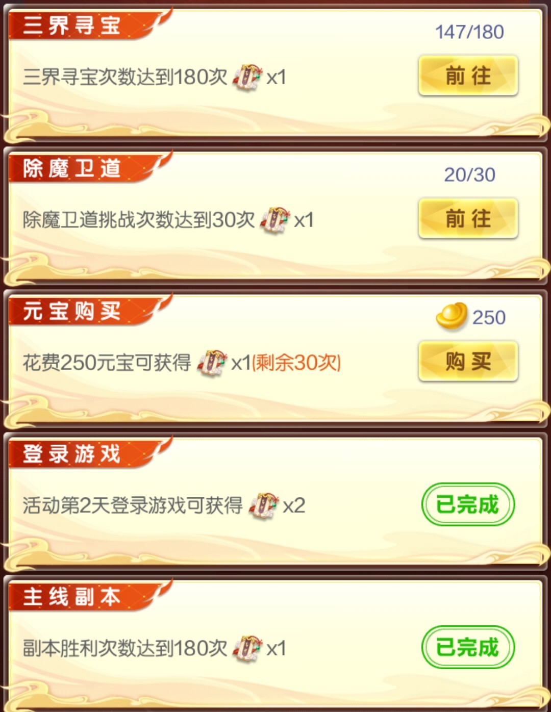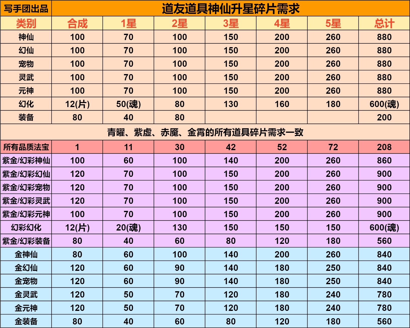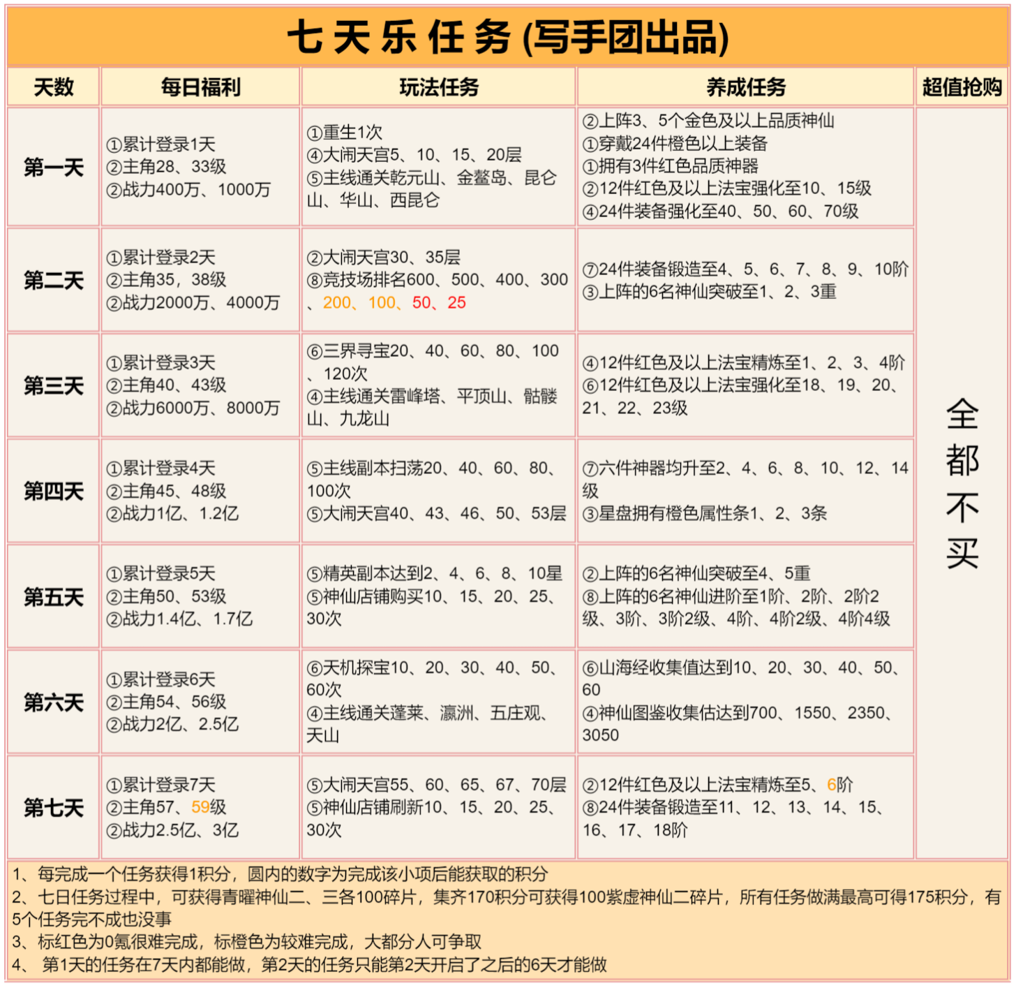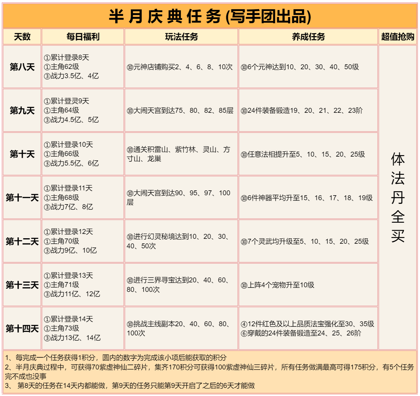 道友请留步是一款神话休闲卡牌游戏,由超人气的收视女王陈乔恩代言。以神话剧情铺开游戏画卷,一句道友请留步,申公豹坑遍天下道友。在这个游戏世界里,你会不会被这一句魔一般的咒语坑到呢赶快来试试吧! 道友请留步阵容推荐混搭阵容 上面的纯族阵容玩几个月后,琉璃、金霄神仙其中一个3星了,就可以开副族搞混搭了。 开副族的时候不需要管副族神仙缘分够不够,先开后补。 当前版本主玩道的平民不开副族,玩纯道。 道族混妖与佛 平民:龙吉+织女+后土+孟婆+九凤 氪金:龙吉+地藏+织女+法海+后土 人族混道 平民:仙姑+女帝+夸父+织女+后土 氪金:仙姑+龙吉+女帝+织女+夸父 佛族混道 平民:地藏+法海+观音+织女+后土 氪金:地藏+龙吉+法海+织女+观音 妖族混道 平民:六耳+孟婆+九凤+织女+后土 氪金:六耳+龙吉+孟婆+织女+九凤 道友请留步怎么玩一、开局 游戏每天9点开新区,开局建议玩人族(高伤害)>道族(加减技能点、控制)>佛族(高防御)≈妖族(debuff流)。 种族选择不用太过纠结,后期转族不困难,人族开局以后再转喜欢的。 攻略不用一次性看太多,按照游戏进度慢慢看,其实都是很简单的东西,但一次看太多会觉得很复杂。 阵容方面纯族就行,单一种族有什么上什么,阵容详细的可前往阵容选择贴查看。 打副本是玩家先手,玩家对战是战力高的先手,出手顺序就是123456号位这样排下去,大多数时候都是把越强的神仙站位放在越前。 这游戏的新手村有10天,这10天内0氪/首充只用在商城体法丹每天买满+10个除魔令,某些玩法次数,vip礼包,这四个地方花元宝,多的全存着,等出村后的活动花。 前面9天不需要存丹,有就用了,尽量到达每天的极限等级,第10天的时候随便留十几个丹,当出村后的任务备用。 出村后的活动购买可前往出村后的活动购买兑换贴查看。 二、寻仙 这不是抽卡游戏,寻仙抽的神仙后续都用不上,不需要花元宝抽。 不用管寻仙抽到的是什么族,想玩什么族直接箱子里选,箱子里的推荐神仙可能不是你想玩的族,不用管推荐。 寻仙冲榜完全没必要的,奖励太破了,玩久一点你会发现除元宝外的其他奖励根本没用。 道友神仙的品级排序是:琉璃>金霄>赤魇>紫虚>青曜>幻彩>紫金,寻仙只能抽到青曜品质的。 在寻仙花的元宝越多,出了新手10天后越难玩,10天内首充党要存30万以上元宝(30万只是最低要求,越多越好),才能保证出了新手村后玩得舒服,出村后的神仙活动能用2.5万元宝直接买到最高品质的琉璃神仙。 三、七天乐与半月庆典 提前查看准备,仙盟商店的法宝选择包、精炼原胚、天机令、唤灵符记得每天买完,天机令唤灵符在任务没开启前先存着,除了竞技场外,这些任务都很容易完成。 七天后每月签到的补签,优先补体法丹与元宝。 如果所在的区没有免费送300抽活动,需要买七天活动那,前一两天打折的寻仙笔。 四、玩法开启等级与注意事项 本应该是最长最重要的一个篇幅,全集中在表里了,里面有很多基础的东西,一定要仔细看!一定要仔细看!一定要仔细看!看不清的保存在相册观看,一键助手设置与万仙阵答案放最下面了。 等级礼包灵武开刃,宠物开熊,幻仙开朱厌,元神随意无区别。 证道之路65级开弩,70级开虎,有0星虎后开犀,75级开相柳,有0星相柳后开玄蜂,90级开涅槃。 如果出村会错过灵武、宠物活动,可以升星弩、虎/犀双1星过渡一下。 五、新区活动介绍 1~2天开启竞技冲榜 排名奖励还行,能让新手村的这10天里玩得比较舒服。 但这个排名顺其自然就行,不需要为了榜上这些奖励而去特意充个几百块或多花好几万元宝,不值得,出了新手村后会发现这都是什么破烂。 2~7天开启玄天幻境 第2~4天打渊狱魔狼,第6~8天打幽冥魔神,这两个boss的榜单伤害与奖励是分开的。 排名同样是顺其自然,不用为了排名专门去充钱花元宝。 每日0点12点刷新幻境挑战次数,12点之前的次数忘打了没事,这个主要看历史最高伤害,累计伤害奖励随便打几下就能拿完;12点以后的次数建议等晚上把所有提升都弄了再去打,伤害比刚刷新就打高得多。 神仙布阵按照加成放就行,哪个阵位加成好,主力神仙就放哪个位置。 加成强度:金>红>橙>紫>蓝。 每回合最终伤害提升>3级暴击>首回合获得神焰/神魂>物攻/法攻加成>出手前随机延长增益效果。 不算暴击增伤,暴击伤害是正常伤害的1.5倍;人妖族是物攻,佛道族是法攻;青曜/紫虚神仙释放技能用的是神魂,赤魇/金霄神仙释放技能用的是神焰。 魔狼奖励 魔神奖励 赤魇宠物三选箱开鸡、二选箱猴。 紫虚宠物六选箱开虎、五选箱开犀、四选箱开鸮;1星虎后开3星犀,1星虎给主核,比0星赤魇宠物强。 青曜宠物开熊,3星熊后开犼。 任何宠物都是优先上阵,上阵没位置了才去玩伴。 其他道具开箱前往开箱攻略查看。 2~7天开启请仙大典 第2~4天的请仙1.0是抽赤魇一神仙,第5~7天的请仙2.0是抽赤魇二神仙,两个请仙活动的概率与充值都是一样的。 单次抽到完整神仙的概率才0.09%,把那种欧皇忽略掉,想靠碎片合成需要抽120~150次,需要充6、700元。 赤魇一的请仙大典性价比太低,建议抽赤魇二的请仙大典,这两个活动的请仙牌是通用的,所以赤魇一的请仙可以充值,不抽奖就行,等留到第5天开启赤魇二请仙再抽。 赤魇二请仙每天做任务可以获得5请仙牌,7500元宝可购买30请仙牌,总共可白嫖45个牌,看运气充200多到400元就可以获得0星赤魇二,还有总数超100的体法