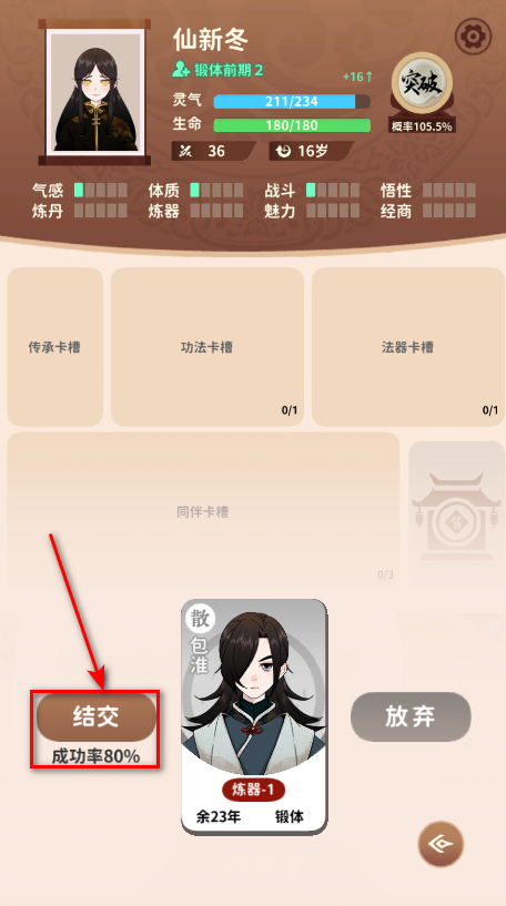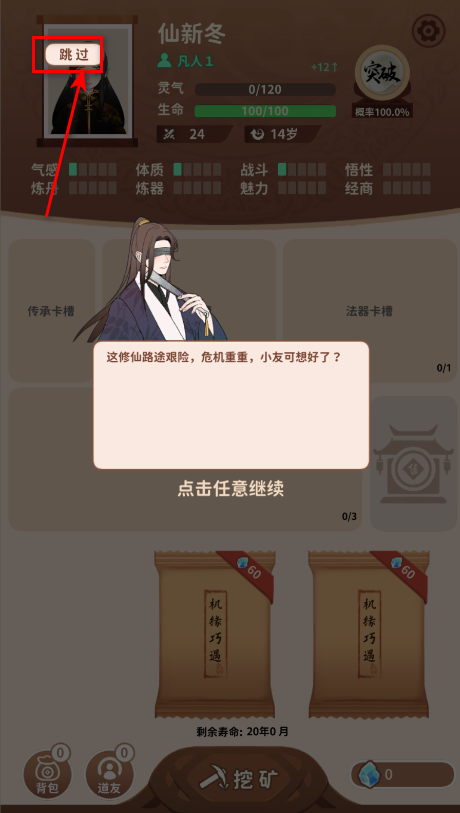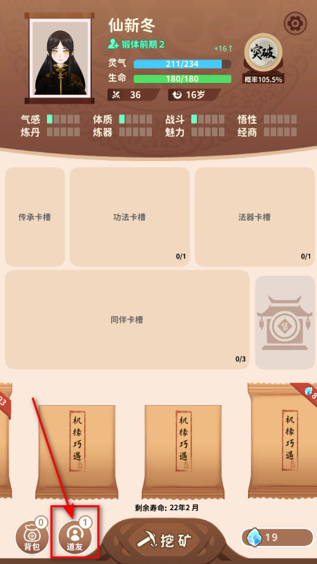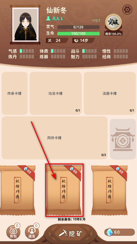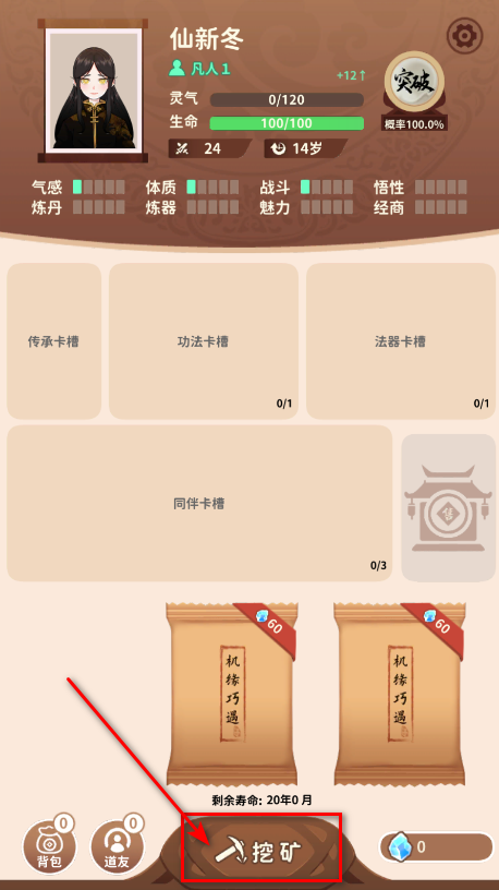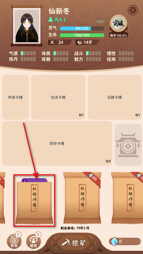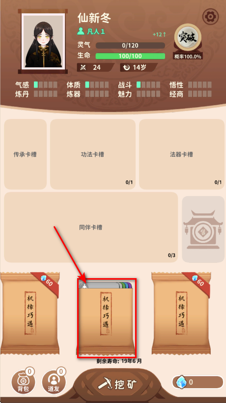 卡包修仙是一款融合放置玩法与卡牌策略的修仙题材手游,玩家将通过抽取各类修仙卡包,获取功法、法宝与灵宠,构建属于自己的修仙流派。游戏画风国风古韵,玩法轻松上手,适合挂机养成。丰富的境界突破、秘境挑战与奇遇事件,让修仙之旅充满变化与惊喜。 卡包修仙怎么玩1.进入游戏,点击跳过,当然大家也可以跟着指引来。 2.前期以挖矿为主。 3.然后选择卡包。 4.我们将卡包内的东西全部点开。 5.每开一次卡包都会让卡包往左移动,大家尽量不要开最左侧的卡包,这样容易开不完就没有了。 6.当灵气满了之后,我们就可以点击突破啦。 7.在卡包内还会有很多其他卡牌比如道友,让我们点击道友菜单。 8.我们可以选择结交或者放弃,看个人选择了,结交也有概率的,不一定是百分百成功。 9.后续的游戏就要靠大家体验啦,游戏充满了随机性,值得一玩。 大量灵石,免广告获得奖励 |