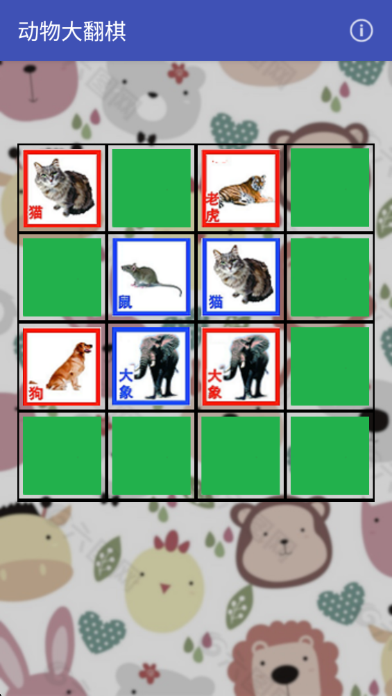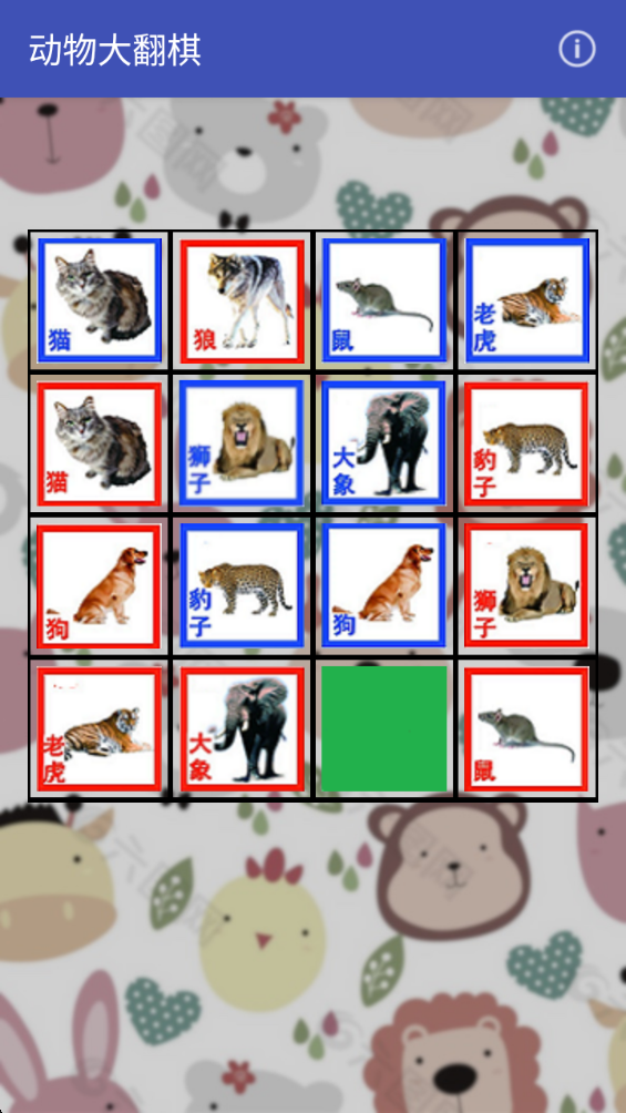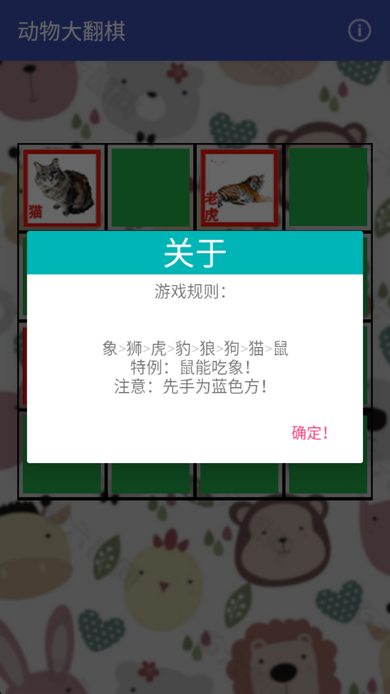动物大翻棋是一款融合了棋类策略与生态知识的创新益智游戏,游戏巧妙地运用了动物形象作为棋子,玩家需要在棋盘上翻开方格,逐步揭示隐藏其下的动物棋子,你的任务就是凭借缜密的策略和果断的行动,吞噬对手的棋子,最终实现棋盘上的一统江山。 动物大翻棋攻略1.游戏玩法点击直接进入游戏界面开始去进行闯关挑战,按照屏幕上棋盘去进行翻棋看哪个颜色的棋被最先翻出来,那个颜色的棋子就代表玩家。 2.游戏规则在游戏开始前可以通过点击屏幕上的游戏规则:象>狮>虎>豹>狼>狗>猫>鼠 特例:鼠能吃象!注意:先手为蓝色方!去进行了解。 3.闯关过程在翻棋的过程中按照生物链的规律去进行吞并比自己小的棋子,直到哪一方的棋子被吃玩,留下的那一方就是胜利者。 |