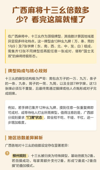 和牌要求: 和牌要求:通过摸牌、吃、碰、杠牌等方式,使手中的牌按照相关规定的牌型条件和牌; 漏胡(可选玩法):任意玩家打出一张牌,能炮胡不胡,则摸牌(或吃、碰、杠牌)前都不能炮胡; 自摸不胡不算漏胡; 如果胡分增加,则解除漏胡导致不能胡牌的禁止; 一炮多响(可选玩法): 能一炮多响:打出一张牌后,有多人可胡这张牌,则都可以胡; 有人胡有人不胡时,不胡不算胡; 不能一炮多响:只能一个人胡牌,胡牌顺序为:点炮下家>点炮对家>点炮上家; 顺子:所谓的顺子,是由三张连续的牌所组成,例如《一万-二万-三万》; 字牌没有顺子; 刻子:而所谓的刻子则是有三张相同的牌所组成; 杠子:为四张相同的牌; 将牌:为两张相同的牌做头; 任何牌都可做将头胡牌; 二、广西桂柳麻将的胡牌方式: 自摸:当自己摸到的牌形成了胡牌牌形,这种胡牌称为自摸; 炮胡:自己出1张牌,这张牌刚好被其他玩家胡牌,则自己为点炮,胡牌者为捉炮; 三、广西桂柳麻将的胡牌牌型: 平胡:按基础牌型胡牌且非特殊牌型则为平胡; 门清:平胡的基础上,没有吃、碰、杠牌,才有门清牌型; 特殊牌型:(鬼牌能代替任意牌胡以下任意一种牌型,默认胡胡分最大牌型) 烂牌:一种特殊胡牌牌型,由3种不同花色组成的147/258/369三个组合和不相同的字牌,共16张牌中的14张牌组成的牌型; 七星烂:一种特殊胡牌牌型,由7张不相同的字牌和3种不同花色组成的147/258/369三个组合的9张牌的其中7张组成的牌型; 清一色:胡牌后,只有一种花色,可有字牌; 字一色:胡牌时,手牌中只有字牌; 碰碰胡:胡牌时,手牌中没有钻和边的牌,且手牌中没有顺子; 全求人:玩家牌都吃或碰或杠下,只剩一张牌,最后炮胡将牌,自摸不算; 七小对:由7个对子组成的特殊胡牌牌型; 豪华七小对:在七小对的基础上,有一组及以上2个对子相同; 双豪华七对:在七对的基础上,有2组2个对子一样; 三豪华七对:在七对的基础上,有3组2个对子一样; 天胡:庄家起手直接胡牌; 海底捞:自摸胡最后能摸的一张牌才算海底捞; 抢杠胡:续杠时,正好有玩家胡此张牌,则胡牌的玩家抢杠胡,杠牌的玩家被抢,算点炮; 不勾选“可点炮”玩法,就不能抢杠胡; 杠上炮:杠牌后,打出一张牌被其他玩家炮胡,按炮胡算分; 杠开:玩家杠牌后,摸回来的那张牌刚好胡牌,算自摸; 四、广西桂柳麻将的计分规则 总分=胡分+杠分+醒分+跟庄+连庄; 勾选“翻倍”玩法,总分=胡分+杠分×牌型倍数+醒分+跟庄×牌型倍数+连庄×牌型倍数; 胡分=底分×牌型分×牌型倍数; 底分:1分; 牌型分:可叠加; 平胡: 庄家:自摸算4分,炮胡算7分; 闲家:自摸算2分(庄家给4分),炮胡算5分; 烂牌: 庄家:自摸算5分,炮胡算 10分; 闲家:自摸算3分(庄家给5分),炮胡算8分; 七星烂:自摸算15分,炮胡算35分; 清一色:自摸算15分,炮胡算35分; 字一色:自摸算15分,炮胡算35分; 碰碰胡:自摸算15分,炮胡算35分; 全求人:炮胡算35分; 七小对:自摸算15分,炮胡算35分; 豪华七对:自摸算30分,炮胡算70分; 双豪华七对:自摸算60分,炮胡算140分; 三豪华七对:自摸算120分,炮胡算280分; 天胡:45分; 地胡:35分; 牌型倍数:不可叠加; 门清:×2; 海底捞:×2; 抢杠胡:×2; 杠上炮:×2; 杠开:×2; 杠分:计算所有玩家的杠分; 直杠:3分;(点杠者出) 碰后杠:1分;(每家出,被抢的杠则不算杠分) 暗杠:2分;(每家出) 醒分:胡牌玩家中几张醒就得几分,每家出; 自摸是每家出醒分;炮胡是点炮玩家出自己的醒分,其他玩家不用出; 勾选“点炮包醒”则点炮玩家要包出所有玩家的醒分; 连庄:2分; 连续2次及以上坐庄后胡牌,才会有该分,固定都是2分; 跟庄:2分; 跟庄成功,庄家给每位闲家各2分; 点炮算分(可选玩法):点炮玩家出自己胡分,其他家不用出胡分; 抢杠胡,算被抢的玩家点炮; 一炮多响同理,点炮者出所有胡牌玩家对应胡分,其他玩家不用出胡分; 自摸算分:一家自摸,其他玩家都要给分; 勾选“杠爆全包”玩法时,玩家胡“杠开”牌型时,有点杠或点碰的玩家包所有输家的胡分,不包杠分; 互包:2位互包玩家任意一位胡牌,另一家要帮所有输家出对应要出的胡分; 同时互包和杠爆全包,按互包来算分; 解散/流局: 勾选“荒庄荒杠”玩法时,不计算所有分数,不勾选时,仅计算所有玩家杠分; 广西麻将十三幺怎么算