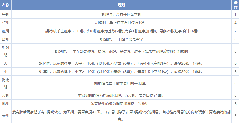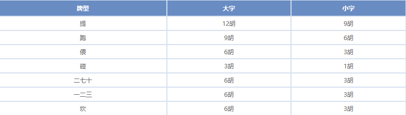 牌型大字小字 提12胡9胡 跑9胡6胡 偎6胡3胡 碰3胡1胡 二七十6胡3胡 一二三6胡3胡 坎6胡3胡 计分的基本单位为囤。15-17胡息为1囤,18-20胡息为2囤,21-23胡息为3囤,依次类推。自摸胡,由基本囤数+1囤。 (全名堂)计分规则