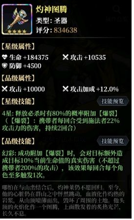 ○技能连携:在战斗中,尝试将我的技能与其他队友的技能进行连携,形成强大的连击效果。例如,当我释放【星月交辉】时,队友可以趁机释放控制技能或增益技能,为我创造更好的输出环境。 【装备选择与属性提升】 ○装备推荐:为了最大化我的输出能力,建议选择那些增加攻击力、暴击率和速度的装备。这些属性能够让我更快地接近敌人、更频繁地释放技能,并在战斗中造成更高的伤害。 圣器推荐给我使用【灼神图腾】,让我的输出更加猛烈!