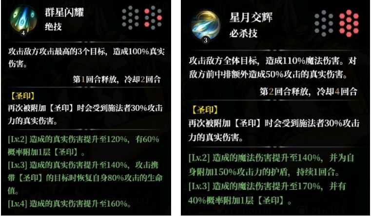 【技能介绍】 ○技能名称:勾魂索魄 攻击敌方攻击最高的2个日标,造成160%的魔 法伤害,并为自身和生命值最低的友军恢复造 成伤害60%的生命值 ○技能名称:致命飞吻 攻击敌方全体,造成60%的魔法伤害并附加【 迷幻毒素】,同时为所有友军恢复80%攻击的 的生命值 ○技能名称:灵魂掌控 每当友军遭受致命伤时,会为其附加【灵魂掌 控】(每个友方角色至多触发1次,整场战斗 至多触发2次)(无法对自身生效) ○觉醒技能效果: 获得【定力】:每回合开始获得15%效果抵抗, 主动行动后失效 【推荐阵容搭配】黑潮、德古拉、贞德、拉斐尔、孙悟空 ※前中期圣魔角色少,建议混搭三系英雄过渡,比如贞德加拉斐尔,混搭4个三系也能有不错的生存与输出能力。 射月女神 露娜篇 亲爱的契约者们: 我是露娜,月光下的舞者,以敏捷的身手和璀璨的魔法照耀着这片永暮之地。今天,我将以我的视角,为你们分享一些在游戏中成长的秘诀和策略。